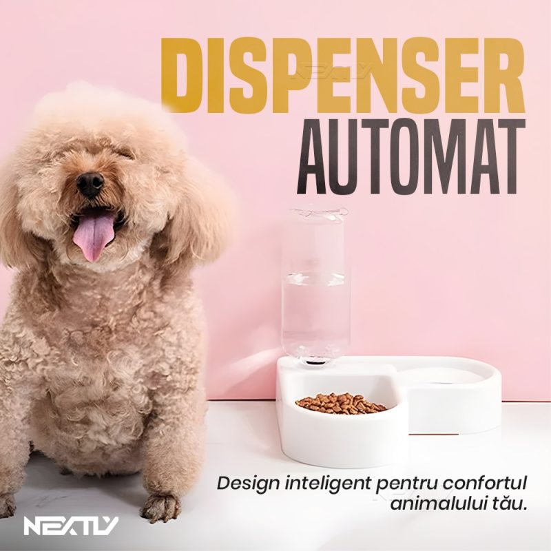 Hranitor automat dublu pentru caini si pisici, NEXTLY, programabil prin butoane, capacitate 3L, boluri inox, tavite plastic, dispenser dublu, inregistrare sunet hranire automata si manuala, alimentare