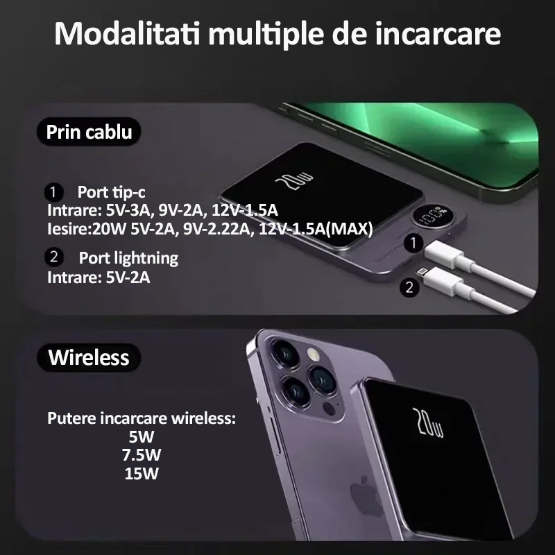 - Compatibila MagSafe, aceasta baterie externa suporta incarcare wireless la 5W, 7.5W si 15W, fiind ideala pentru diverse nevoi de incarcare.