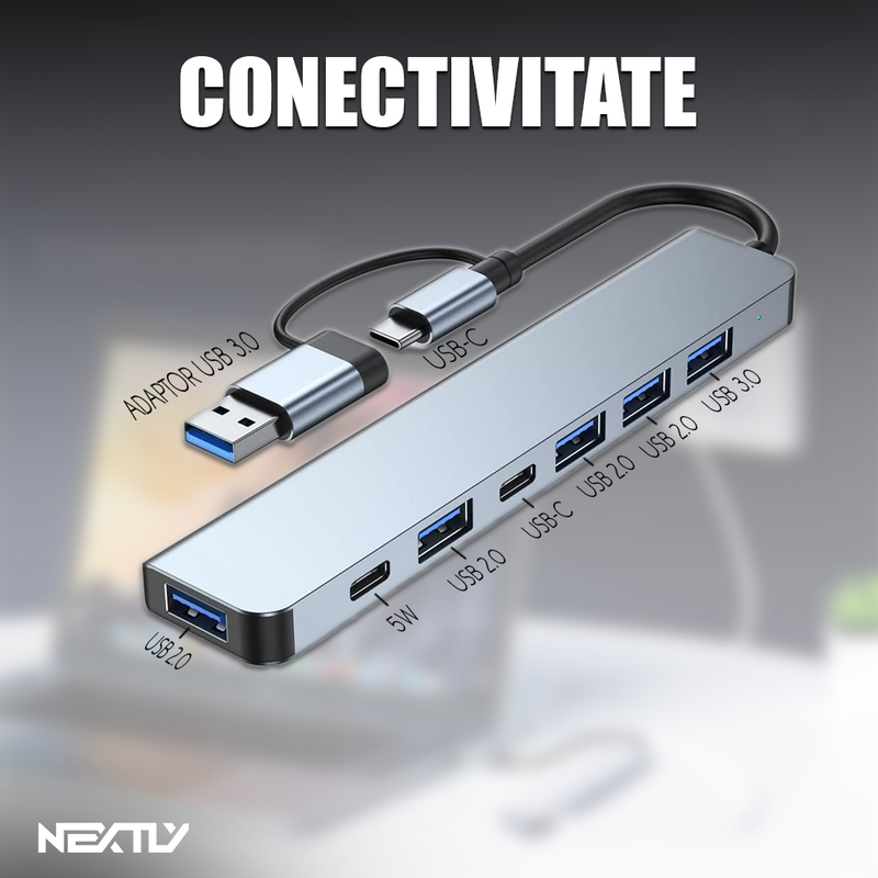 Hub USB Tip C 7 porturi, NEXTLY, adaptor USB A inclus, 4 x USB A 2.0, 1 x USB A 3.0, 2 x USB C – PD, gri metalizat