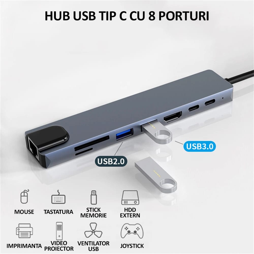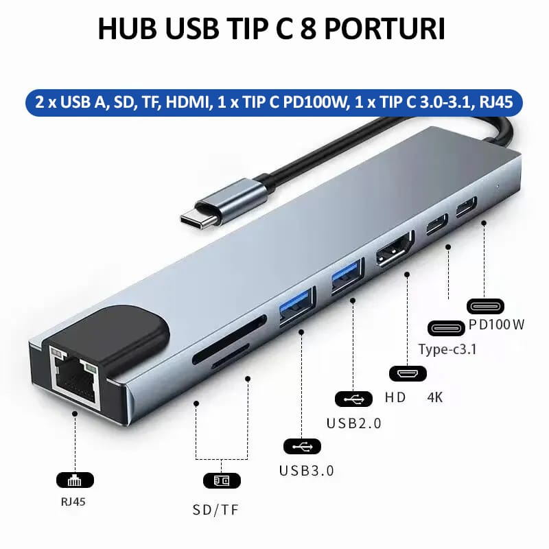 Hub USB Tip C 8 porturi, NEXTLY adaptor multiport, 1x HDMI, 2x USB A, 2x USB C, 1x RJ45 100MBps, cititor card SD/TF, USB 2.0-3.0