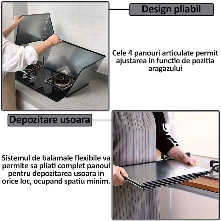 Design pliabil – cele 4 panouri articulate permit ajustarea in functie de nevoie sau pozitia aragazului.