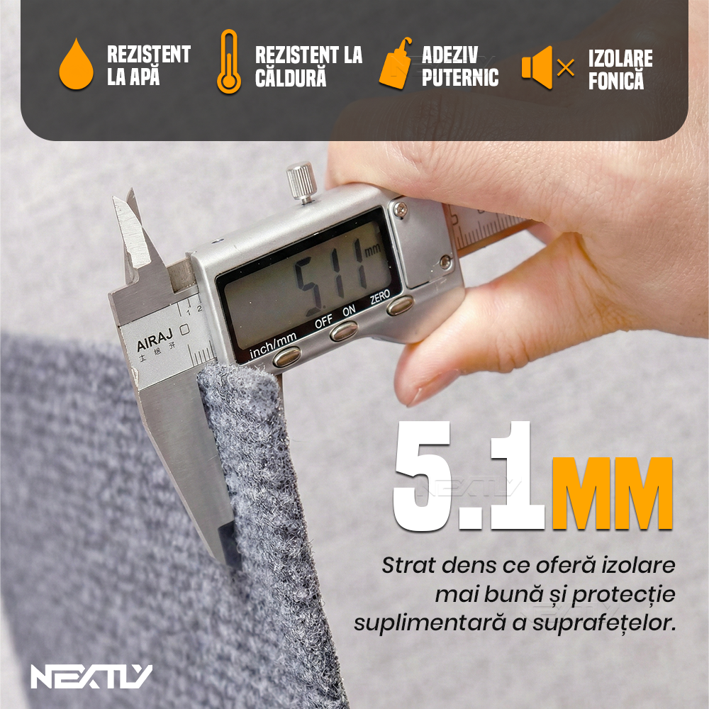 Stratul dens de 5 mm ofera izolare fonica si confort sporit, iar materialul rezistent la umiditate si uzura asigura o utilizare de lunga durata.