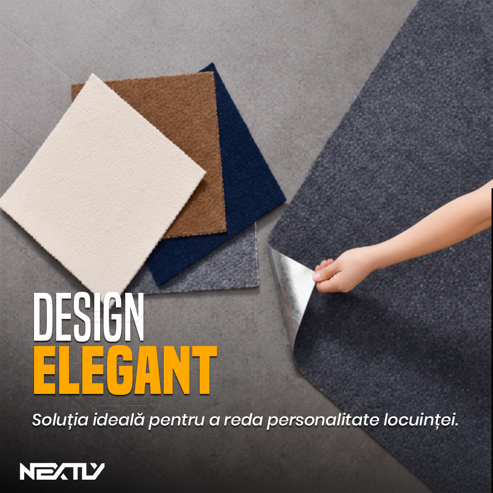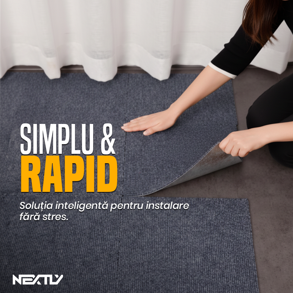 Transforma rapid orice spatiu cu placile de mocheta autoadeziva NEXTLY, o solutie moderna pentru podele confortabile, elegante si usor de instalat.