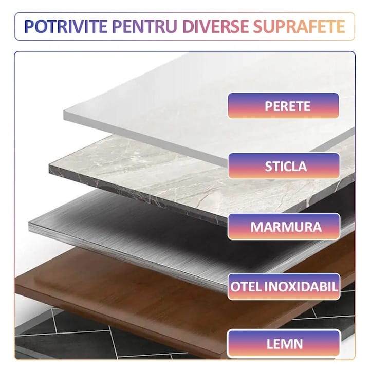 Se pot aplica cu usurinta pe diverse suprafete netede, inclusiv perete, sticla, marmura, otel inoxidabil, plastic, etc., asigurand o fixare