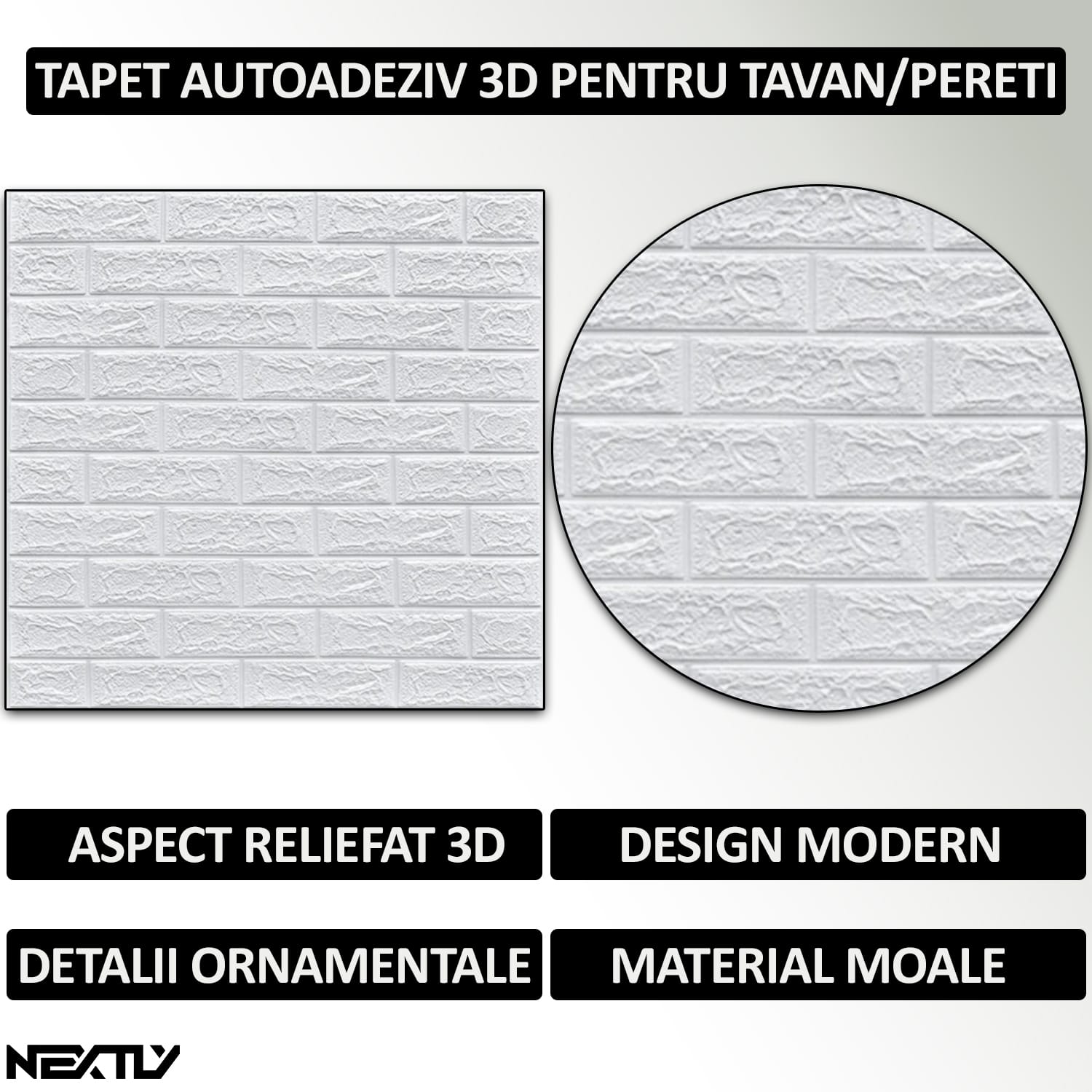 Set 20 x tapet autoadeziv 3D NEXTLY, pentru tavan/perete, design caramida, waterproof, ajustabil, adeziv puternic, usor de montat, suprafata acoperire 10.6MP, 70×77 cm, alb, cod 1