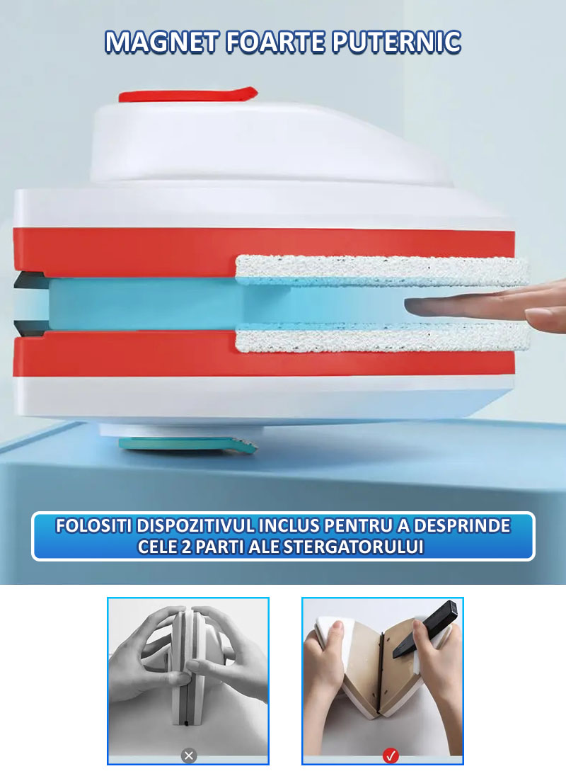 Stergatorul de geamuri cu magnet este dotat cu un sistem de magnetism extrem de puternic, care asigura o aderenta stabila si sigura pe