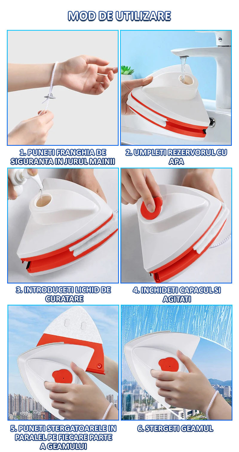 pe suprafata geamului. Aceasta caracteristica va permite sa finalizati curatarea intr-un singur pas, obtinand rezultate impecabile fara a fi