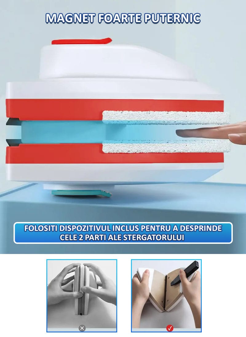 Stergatorul de geamuri cu magnet este dotat cu un sistem de magnetism extrem de puternic, care asigura o aderenta stabila si sigura pe