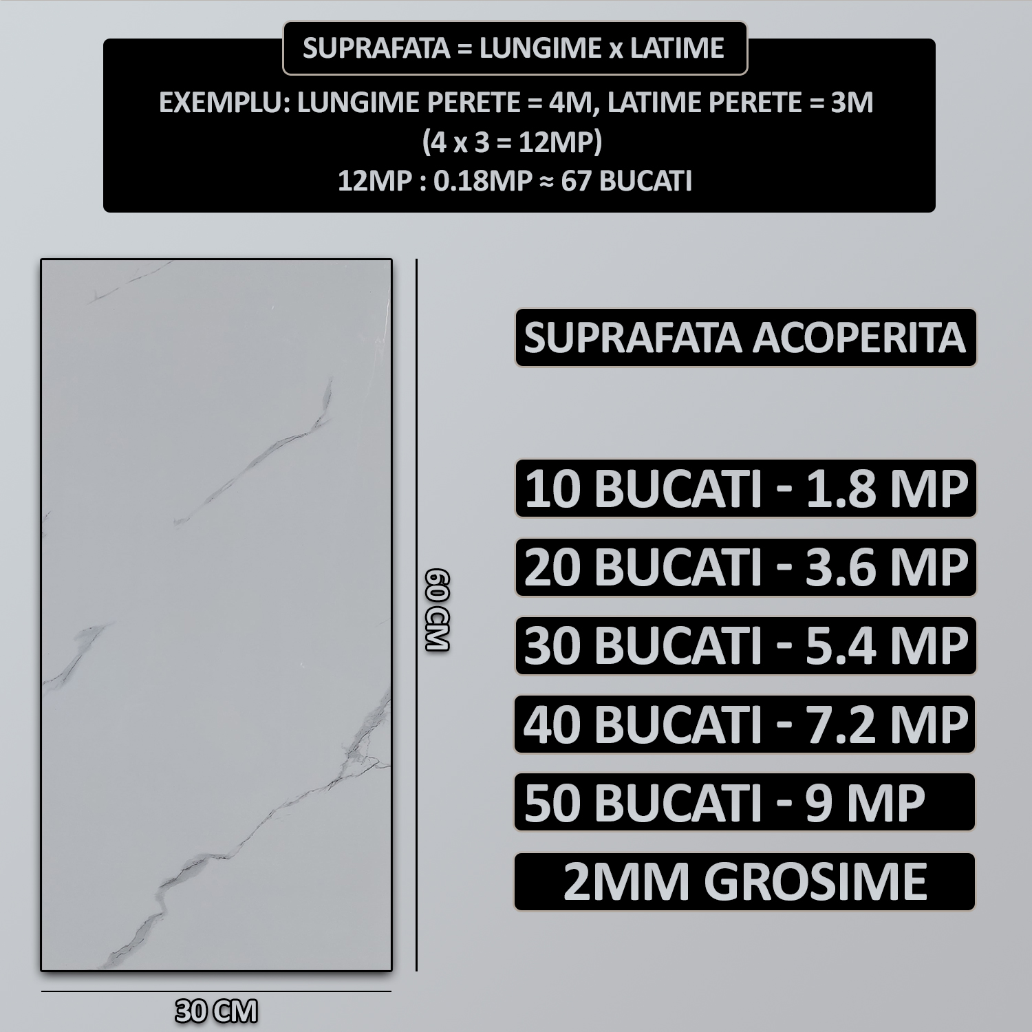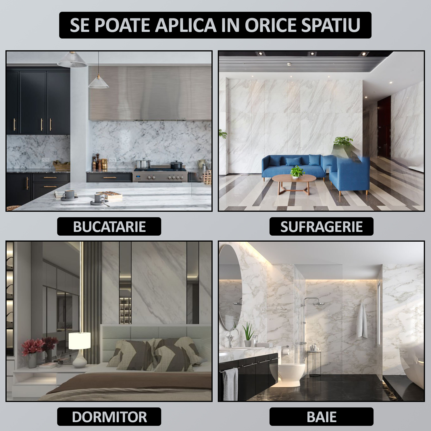 Tapetul cu aspect de marmura se poate aplica cu succes pe o gama variata de suprafete, precum: perete tencuit/vopsit/desenat/mucegait/decojiti/crapati, gresie, faianta, lemn,