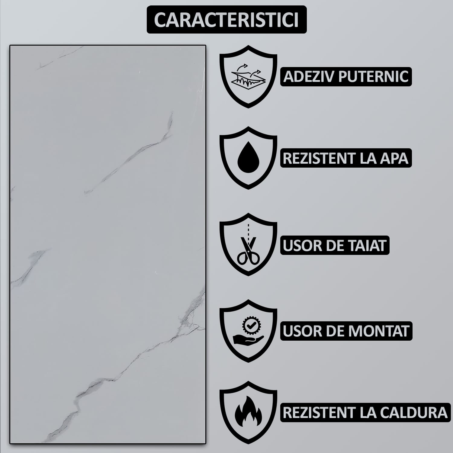– adeziv puternic – tapetul dispune de un strat de adeziv pe partea din spate, asigurand astfel o fixare sigura si durabila pe diverse suprafete, fara a necesita adaugarea