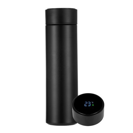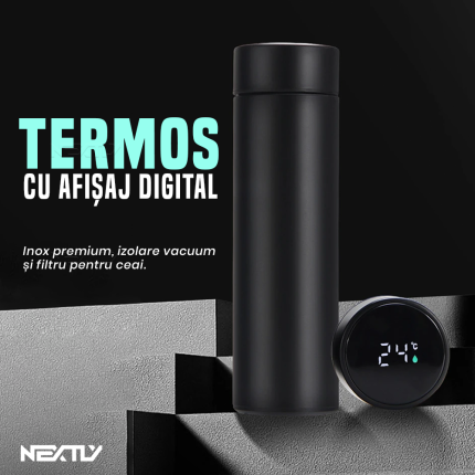 Termos cu afisaj digital temperatura NEXTLY, ecran tactil, protectie IPX7, izolare puternica, filtru ceai, otel inoxidabil, 500ml, 22.5×6.5cm, negru