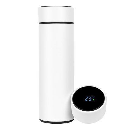 Termos cu afisaj digital temperatura NEXTLY, ecran tactil, protectie IPX7, izolare puternica, filtru ceai, otel inoxidabil, 500ml, 22.5×6.5cm, alb